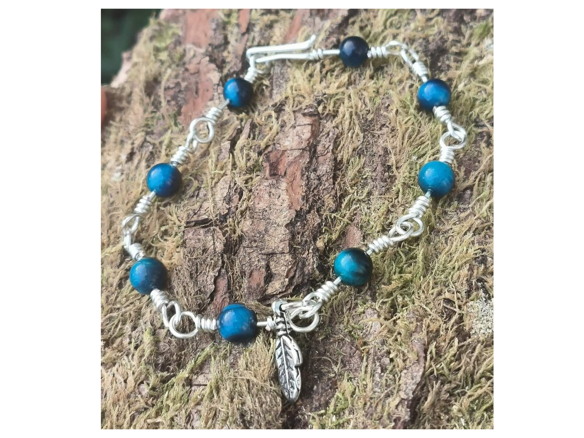 Pictured bracelet is made with 6mm round beads and silver plated copper wire and has a cute metal feather charm. Please be aware that stone colours and charms may vary slightly