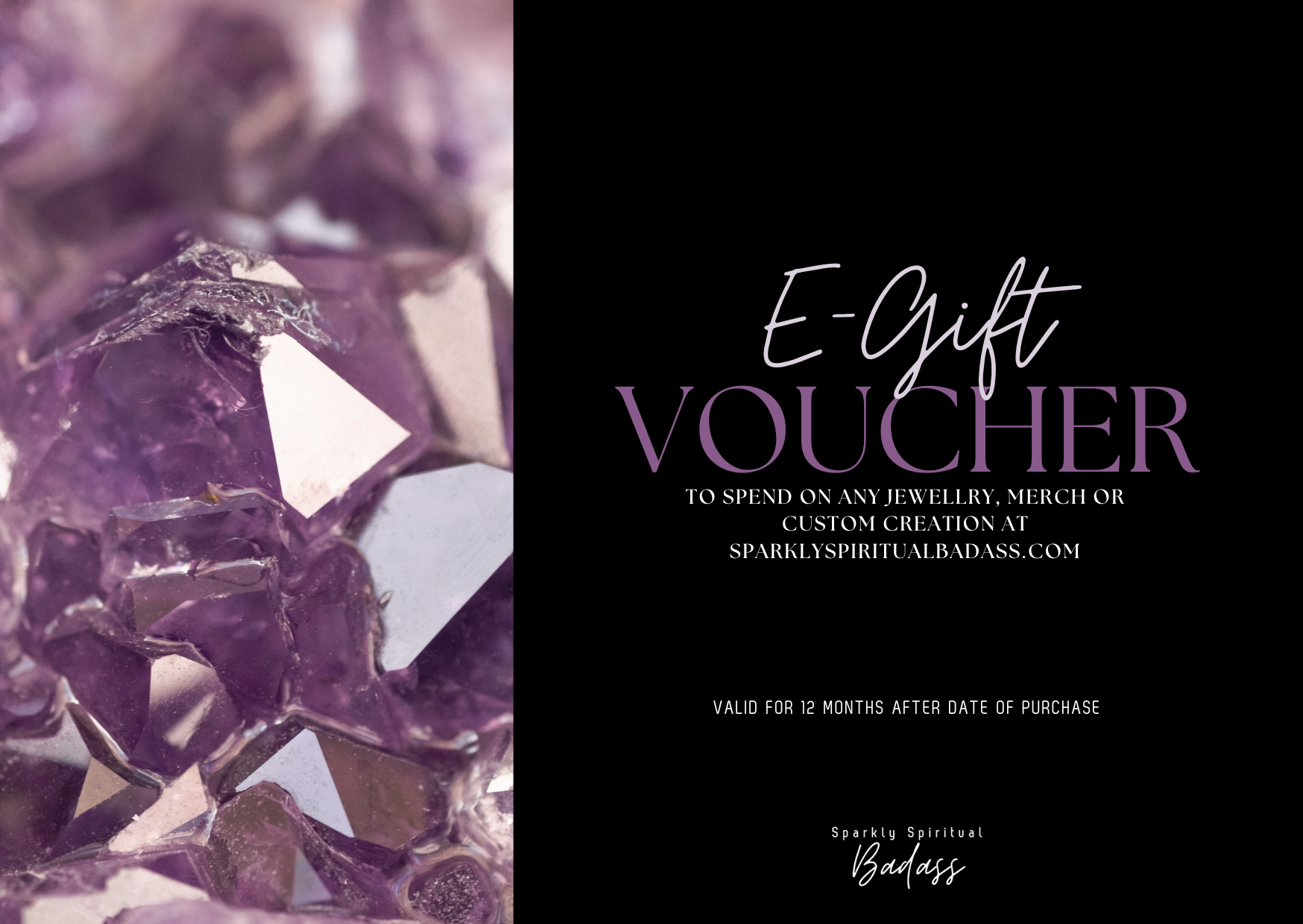 Sparkly Spiritual Badass e-Gift Vouchers are redeemable for any jewellry, merch, spiritual services or custom creation in the web store.